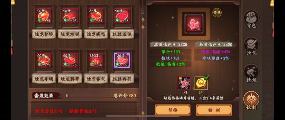 2、4惊鸿+2麒麟+2烛龙,此种搭配可以提供给玩家暴击+5100,搭配8级黄宝石暴击+1886,可以有着7000的暴击属性,再加上饰品铭刻的暴击值,达到8000暴击的分数线也是很有希望的,缺点是相对的命中不够,需要提升无双猎命战魂的等级至8级+。