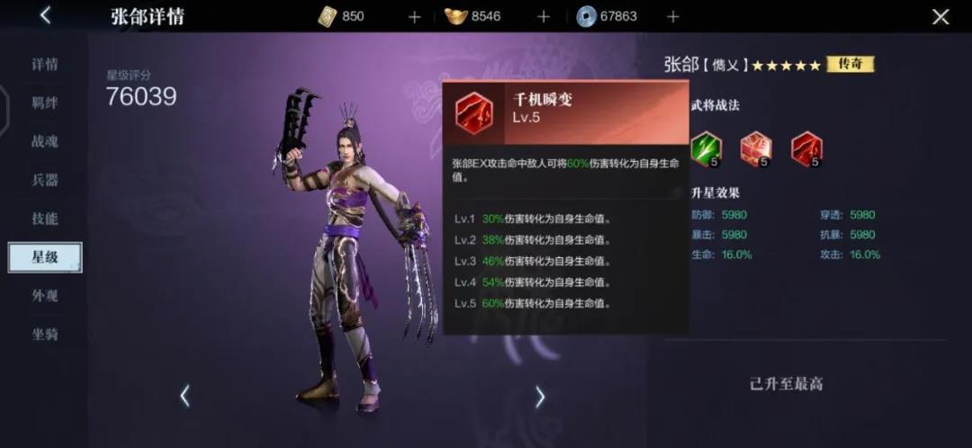 【千机瞬变】张郃EX攻击命中敌人后可将一定比例(30-60%)伤害转化为自身的生命值