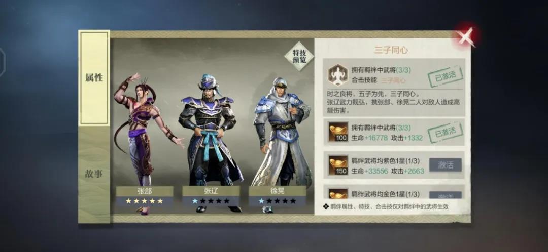 最后则是【三子同心】羁绊,时之良将,五子为先,三子同心,在给到大幅的生命和攻击加成时,还能够激活华丽而又强大的合击技能,在持续控制的同时对敌将造成巨量的伤害,对于缺乏强控能力的张郃来说不仅是补足控制能力,还能够在关键时刻打出强力输出,起到力挽狂澜,一锤定音的效果。