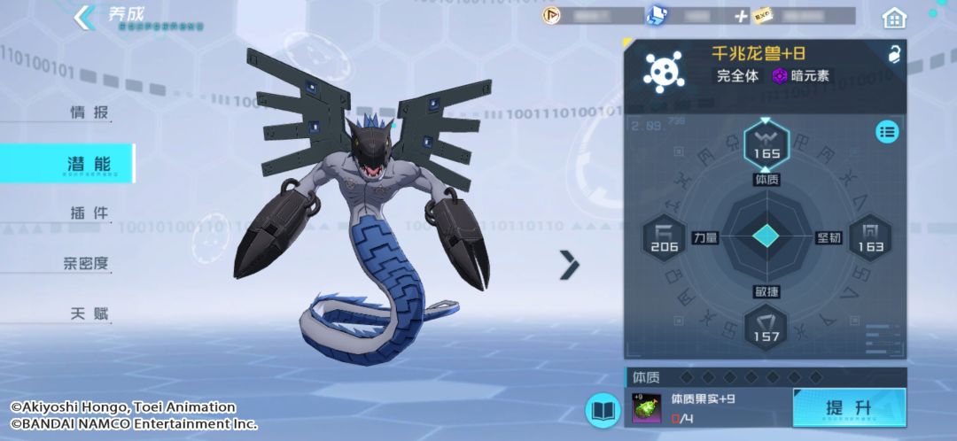 游戏内数码宝贝的属性随等级提升而提升,数码宝贝升级可直接消耗经验池中的经验,在日常消耗体力的玩法中,可以获取到足够多的经验值;提升数码宝贝的潜能可直接增加数码宝贝的属性,潜能果实只需要消耗体力就能获取。