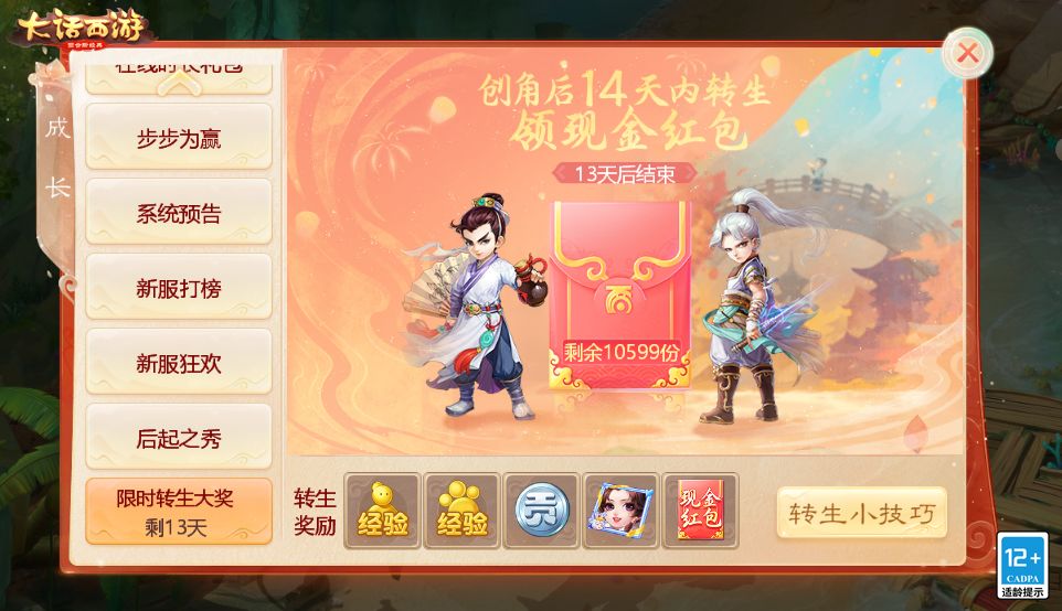 除了三场开服庆典外,【六六大顺】还准备了【转生红包】,只要侠士们在开服后14天内完成1转,就能够获得5元至100元的100%现金红包奖励!