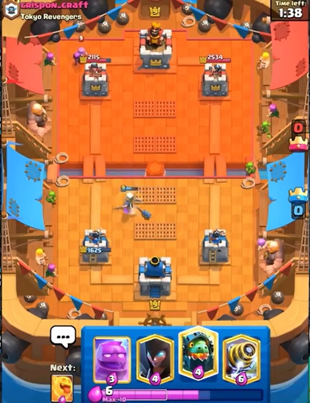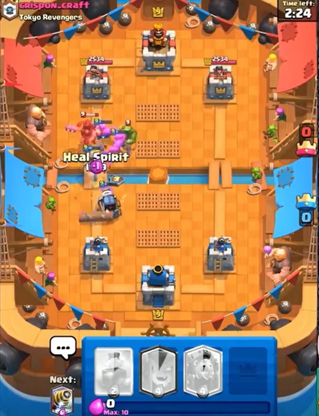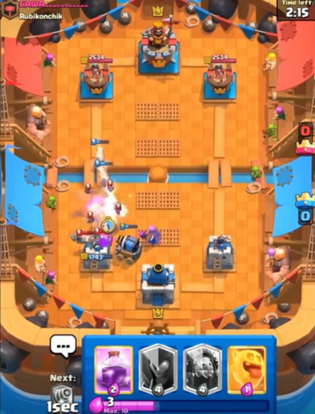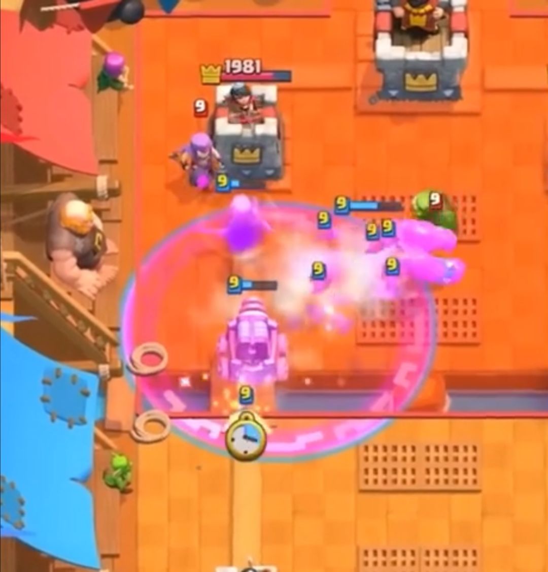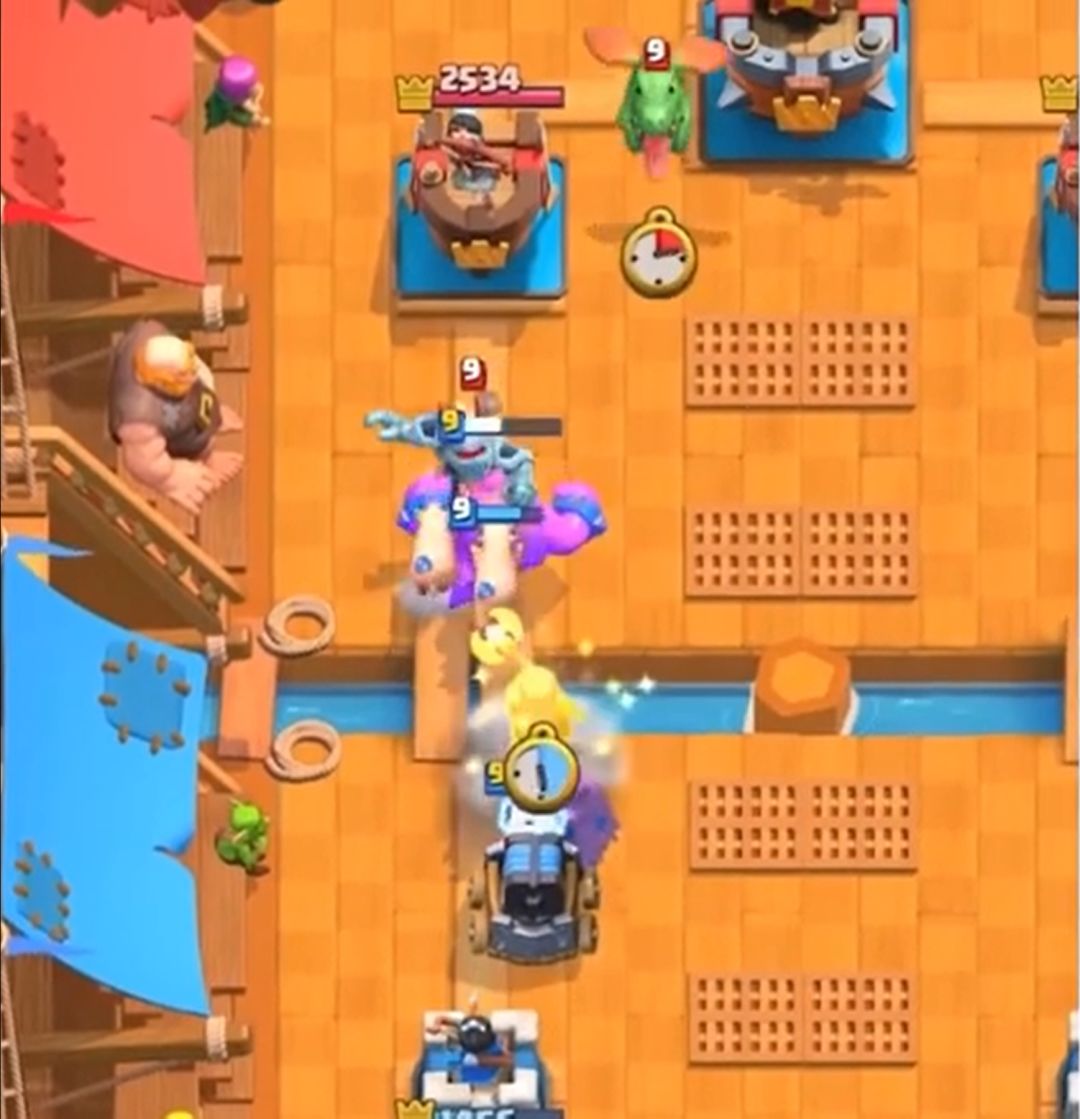 (不知道对面法术之前还是不要这么莽为好。如果对手有大闪、火箭这类法术,这一波很有可能打不出多少伤害,还有可能被对方的返场单位把塔削掉一层皮)