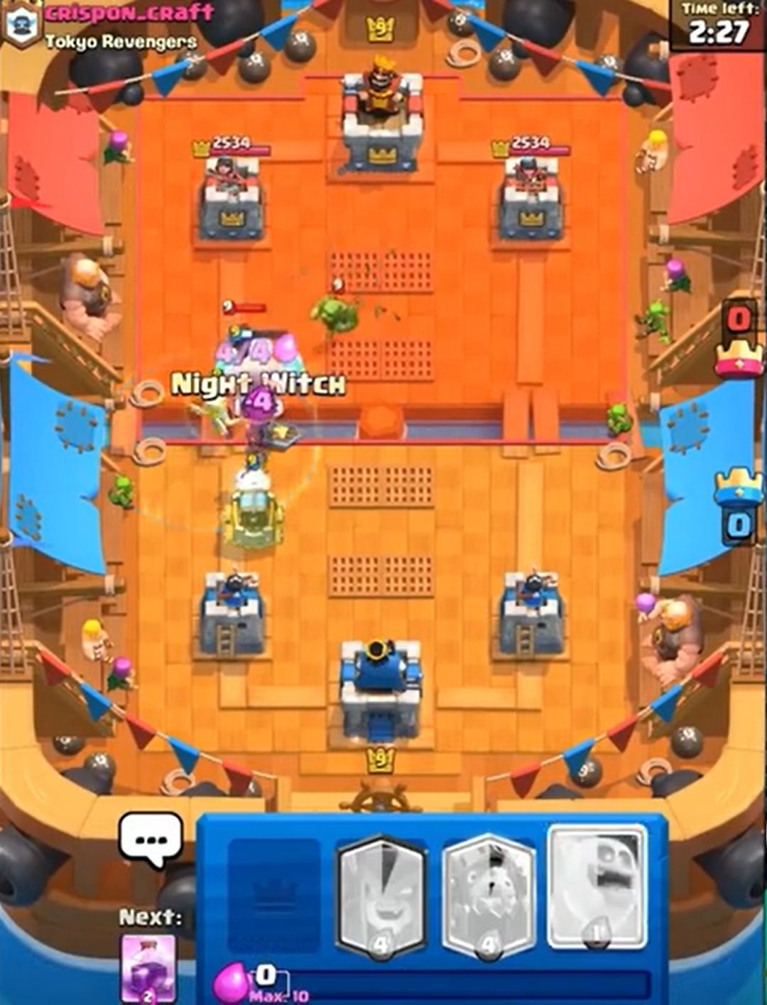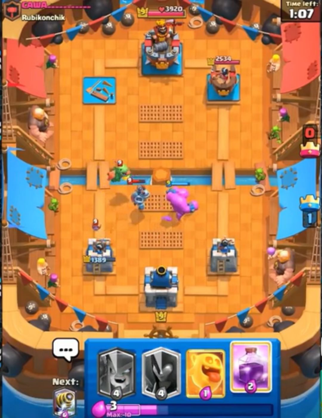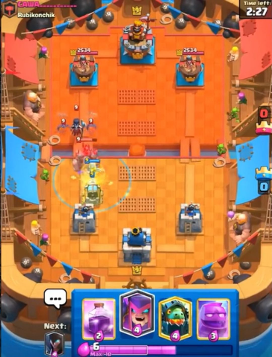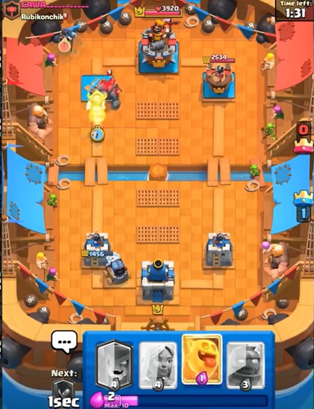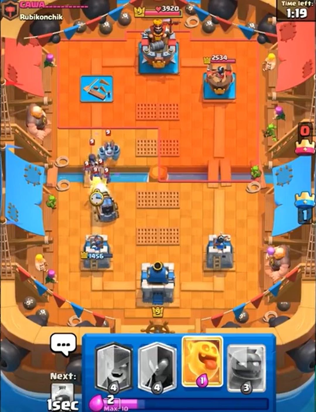 (如果对手开局沉底石头人,就用地狱龙或者电车去对。大概率还要再交个天使或者暗巫。只要牌序能对上,基本上不可能被石头人一波推掉一塔)