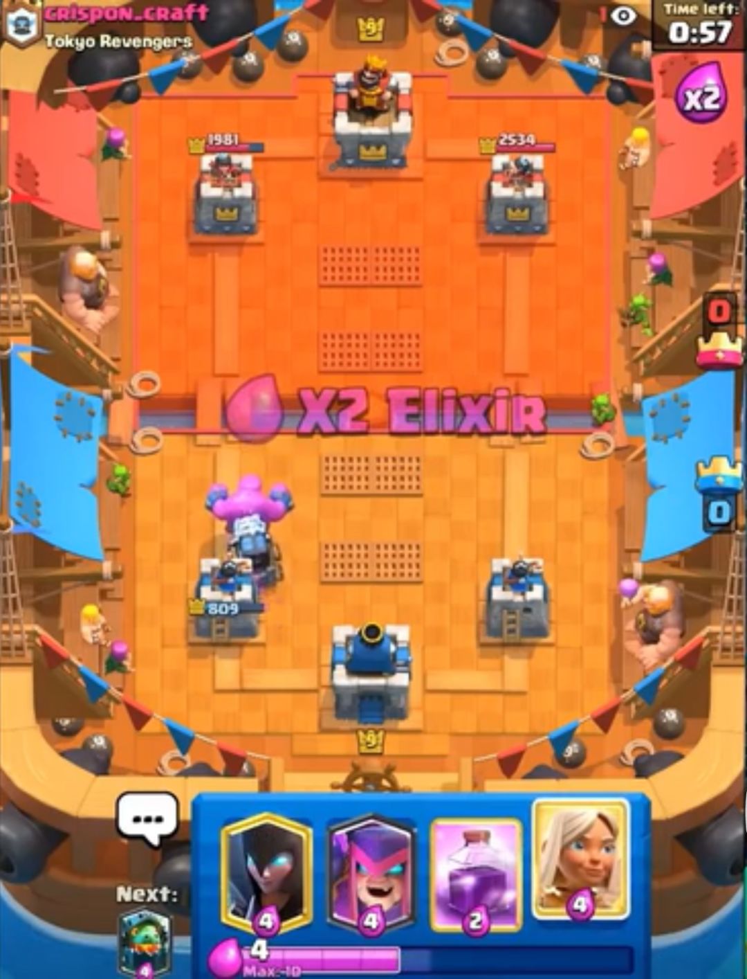 (目前返场兵:几头猪猪,残血电磁炮,满血女巫婆婆,快爆开的水人)跟上暗巫+狂暴,看看能不能直接推掉一塔