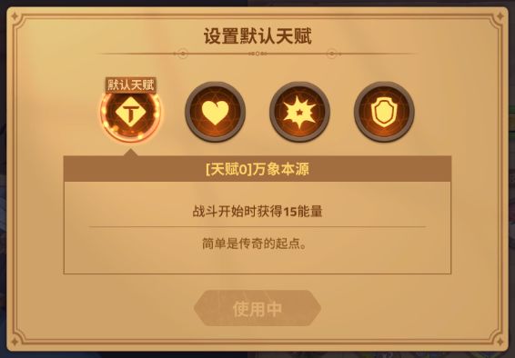 侍从拥有的基础天赋(初始默认天赋)【万象本源】效果为:战斗开始时获得 15 能量。