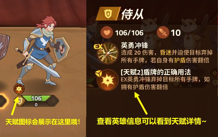 侍从还拥有三个专属的天赋,其中之一【盾牌的正确用法】效果为:EX英勇冲锋会弃掉目标所有手牌,如拥有护盾则伤害翻倍。