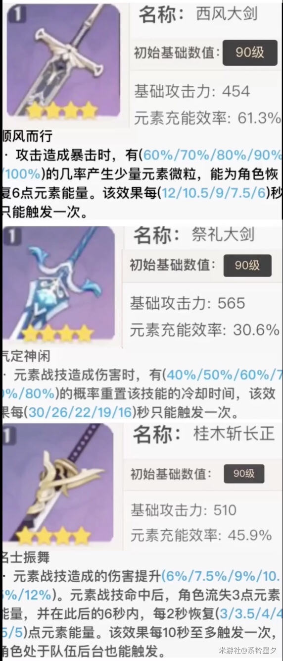 元素充能效率:西风大剑61.3%>祭礼大剑30.6%>桂木斩长正45.9%