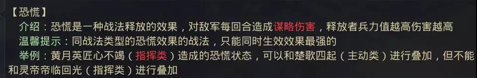 举个例子,【匠心不竭】是指挥战法,【匠心不竭】(指挥战法)施加的“恐慌”效果和【帝临回光】(指挥战法)的“恐慌”效果冲突,但这二者和任何主动战法的恐慌效果都是不冲突的。