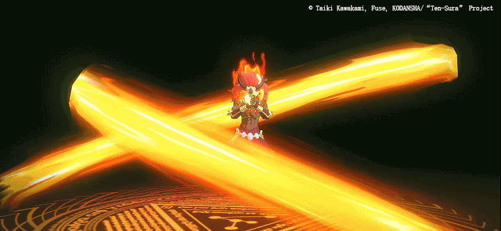 野兽露出獠牙,一边炸毛一边积攒魔力,随后仰天长啸召唤出席卷大地的黑色旋风,让一切归于寂静。一路火花带闪电扫荡而来。身为主人的利姆鲁将黑炎附于剑上,跃起劈斩敌方,一时之间分不清东西南北,只知道自己惹上了不该惹的人。