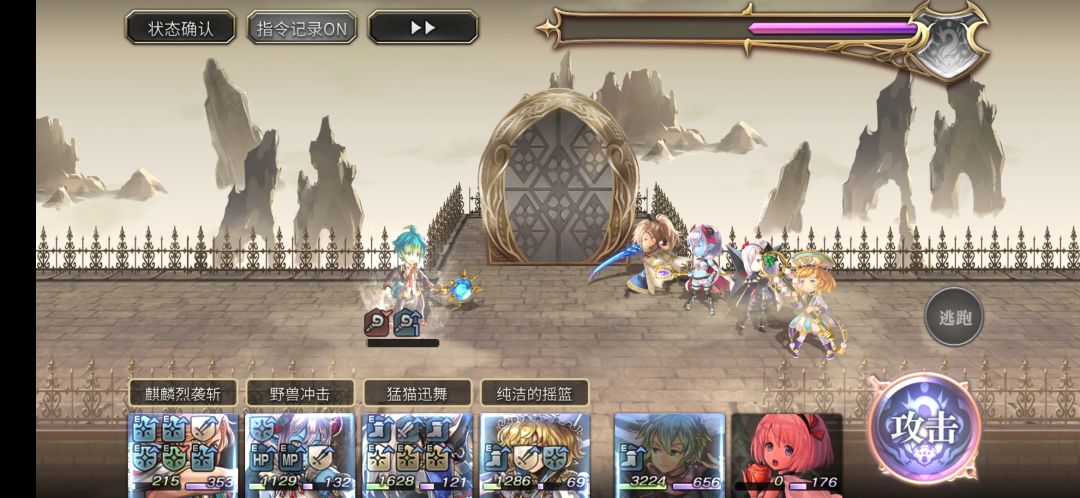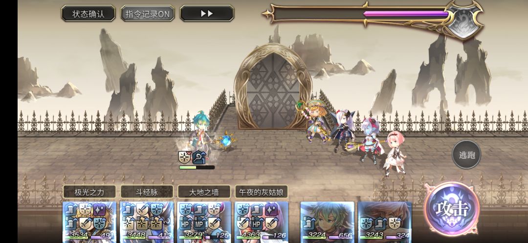 战斗过程中:极光之力、苍夜叉、大地之墙、心之女王、午夜的灰姑娘。这几个技能的效果至少要同时存在三个,不然就有可能会随时团灭。其中“午夜的灰姑娘”这个技能需要灵活运用,后面我会详细讲。第一回合主要以加buff为主,详情可参考第一张图。