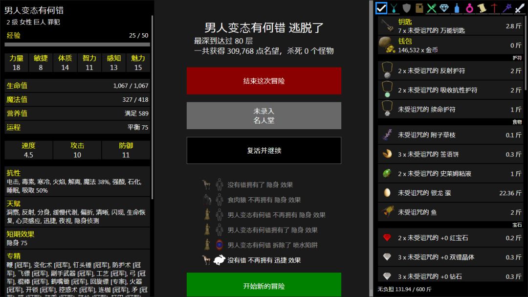 然后是去除铁球惩罚,现在去除惩罚的常规方法有 运程足够祈祷,祝福的水流卷轴,诅咒移除卷轴,找神殿净化,取消杖。「变形也可以去铁球,如果变形的没手没脚的话。」所以遇到法杖就射,遇到卷轴就读,能去除铁球就是赚的,要不然会更困难一点。