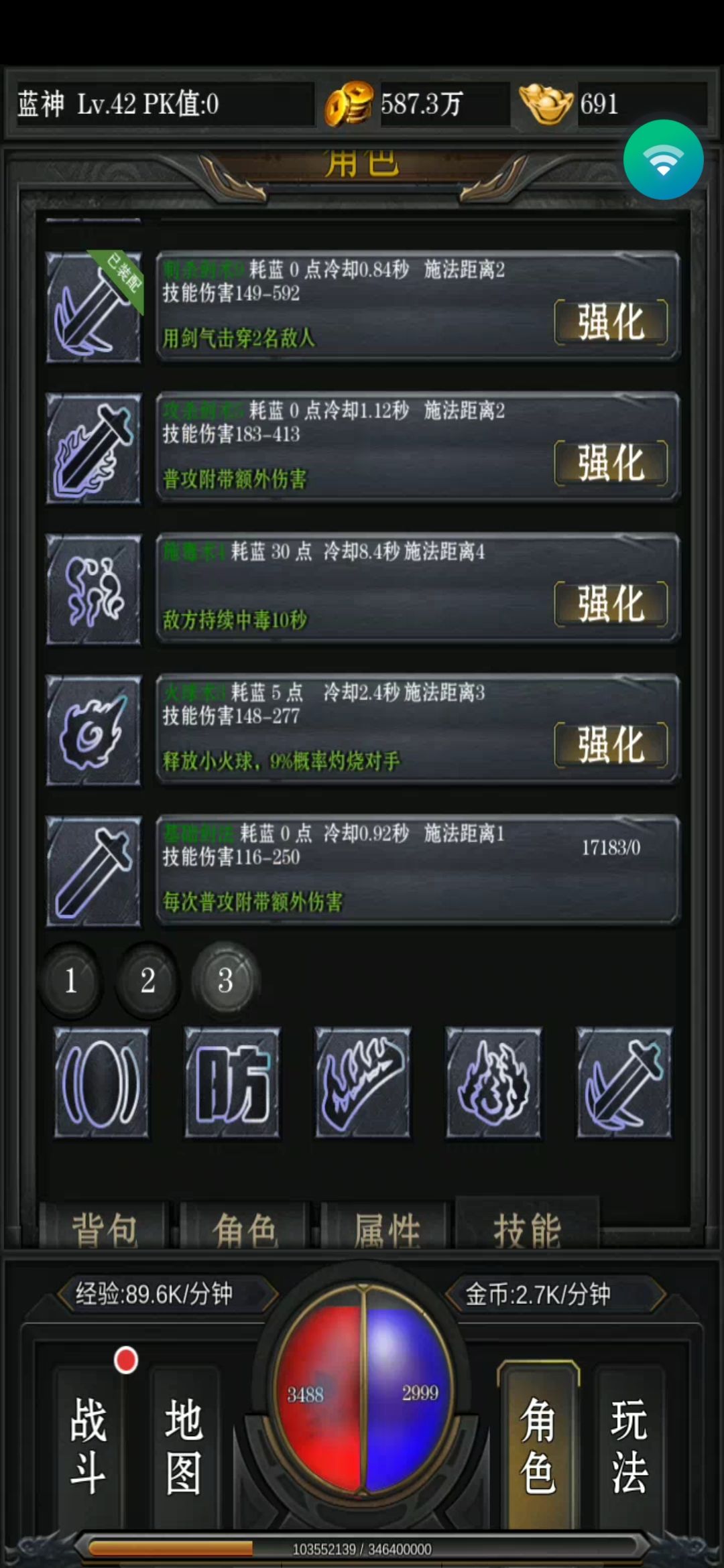 其中技能界面是经常要用到的,经常需要切换技能,其中1、2、3。可以搭配3种技能,随时切换。