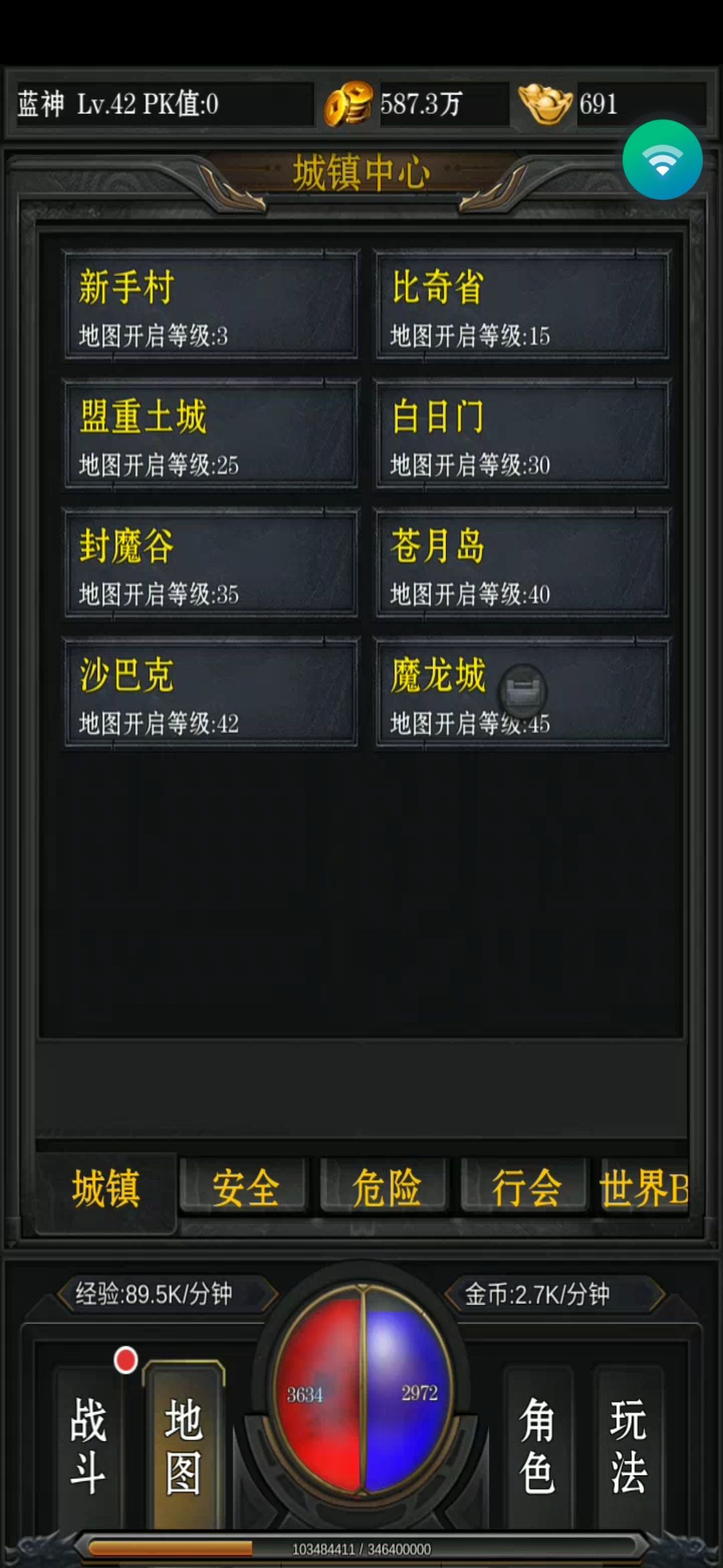 地图分别五大类城镇、安全、危险、行会、世界boss。