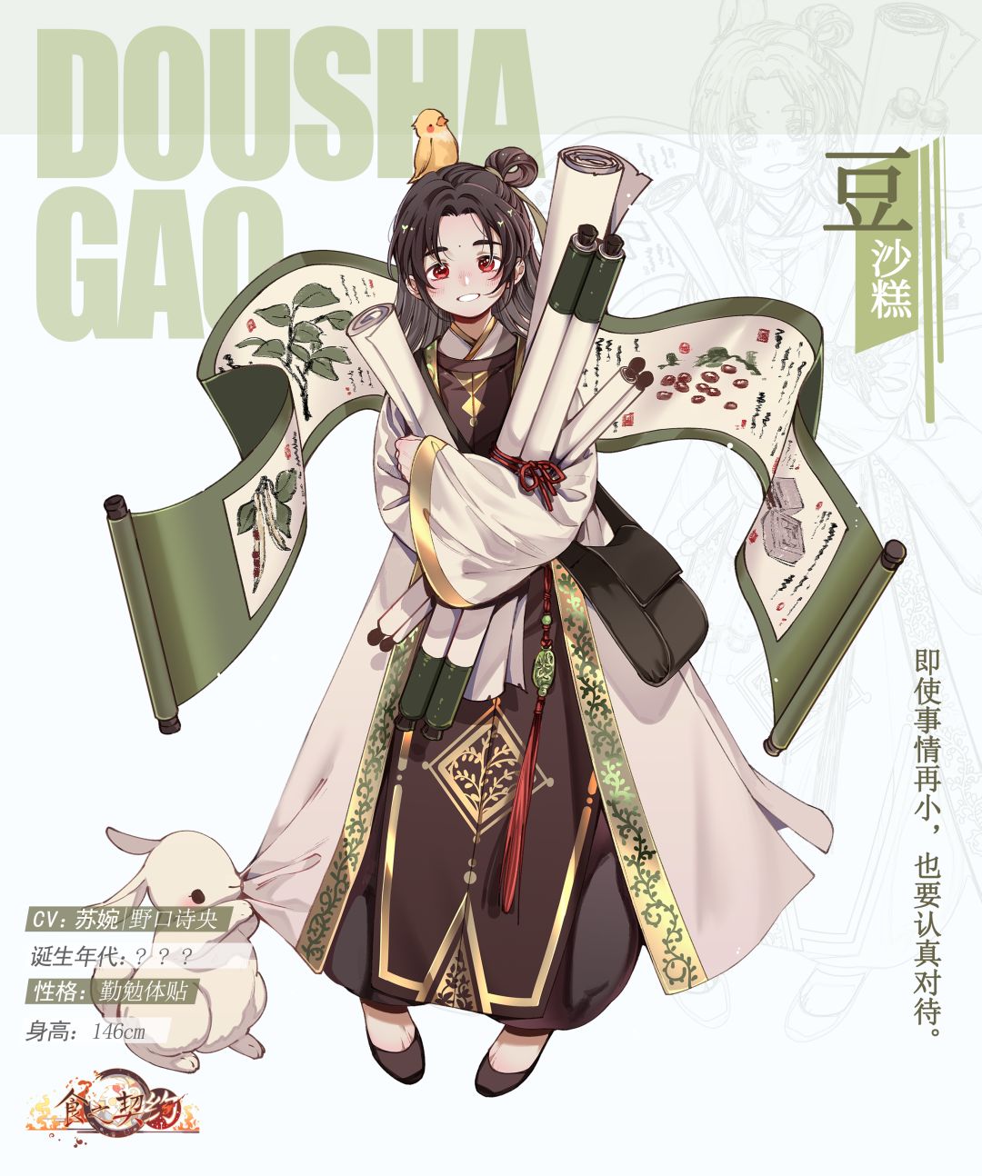 豆沙糕是中国一道传统糕点,所以在这道美味的糕点中所诞生的飨灵,设定了一位国风小少年的形象。