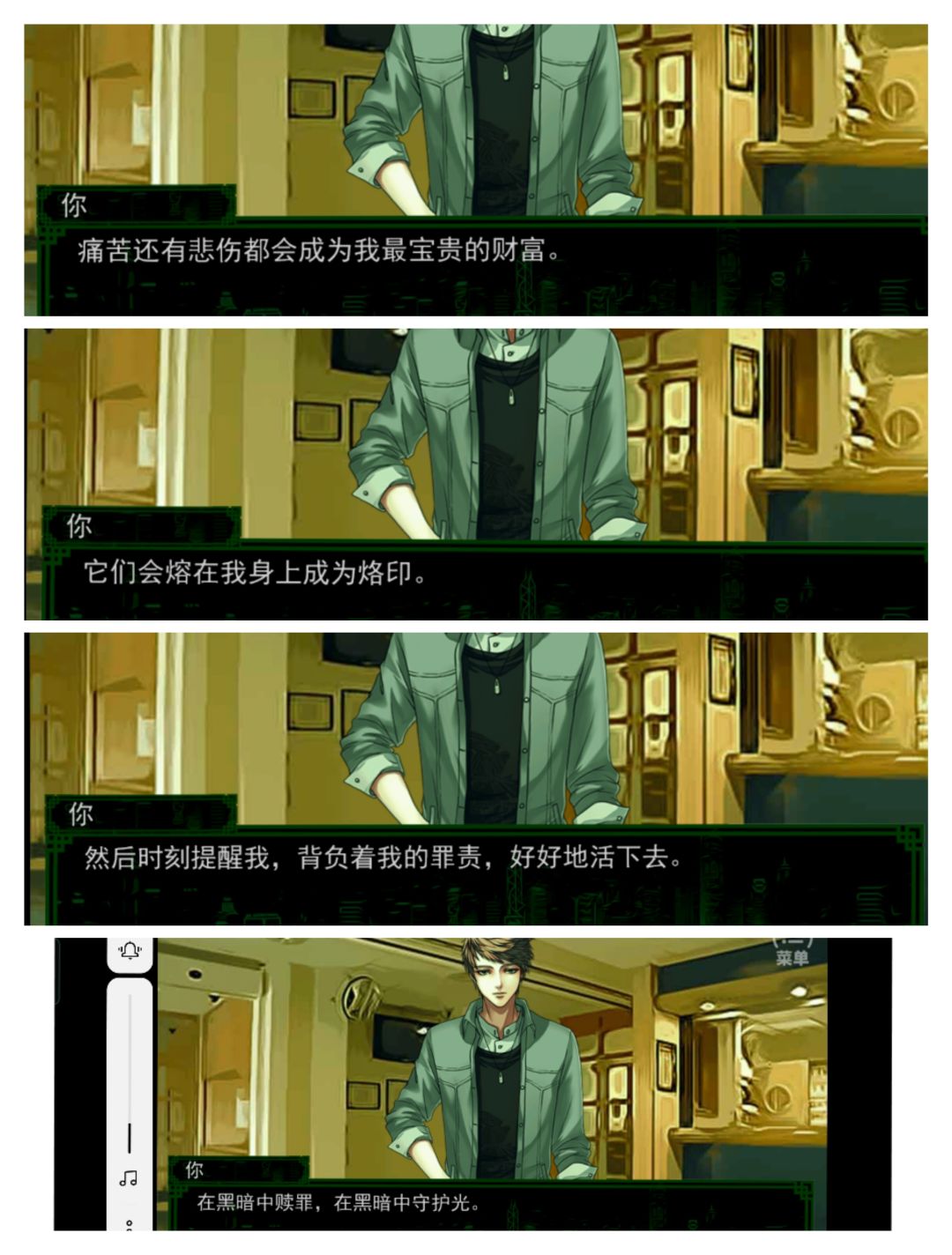 在玩的过程中,其实发现他自己也有内心深处的悲哀和忧郁啊是吧,可是我玩到结局也没太清楚,这份忧郁到底是从何而来,起码应该搞个番外解释一下他究竟遭遇过什么吧,是有保护的人,结果还是被黑恶势力杀害了?