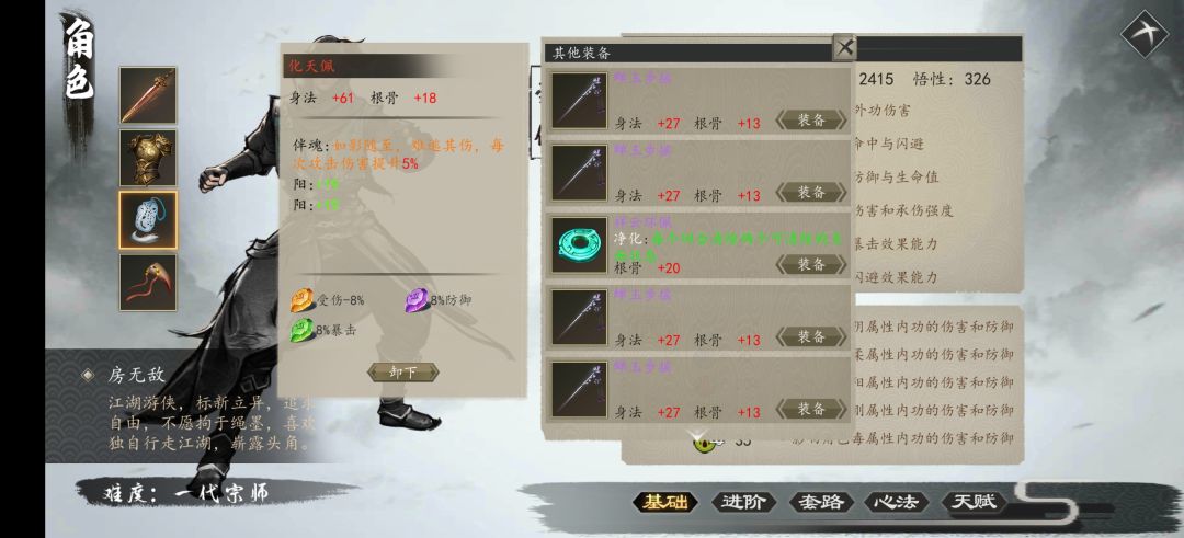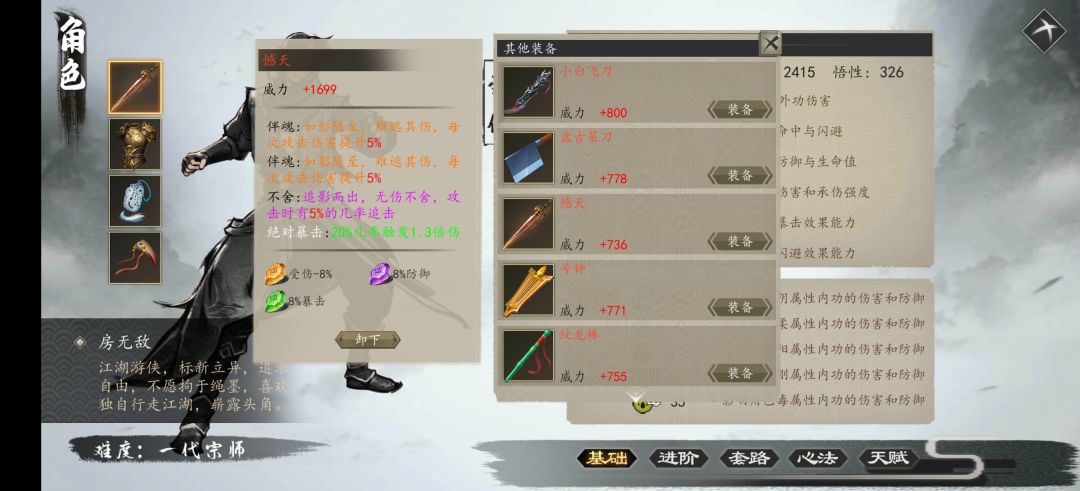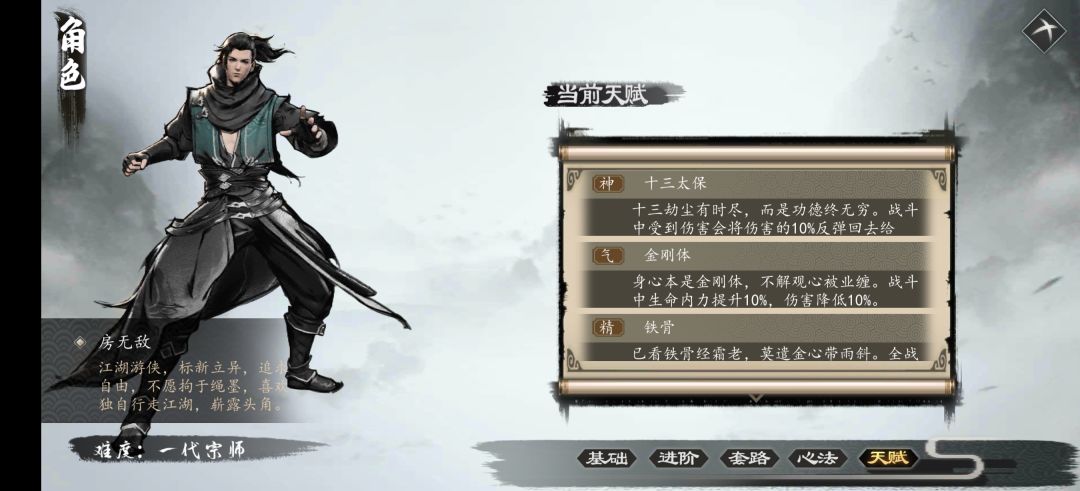首先是天赋,十三太保意味着可以切换反弹打法,也意味着可以随意决定发展方向,其实用阳刚属性天赋更好;金刚体如果像我这样四维接近满的也不如用武器威力1.5,如果四维不满,那么我觉得更优,内力10%对攻防都有效,还有生命10%的优势;铁骨的免伤10%还是挺有意义的,因为我的组合最不缺伤害。