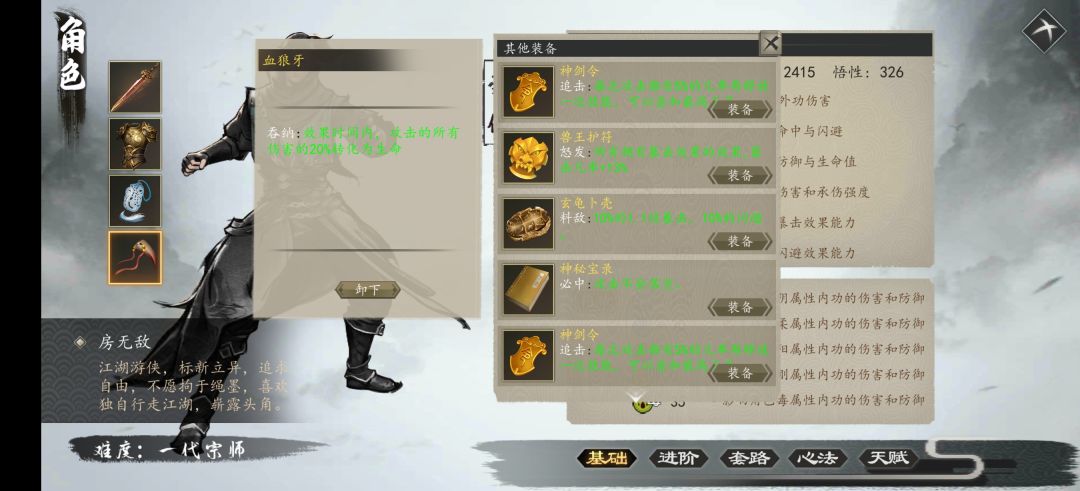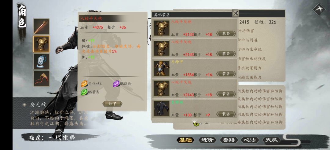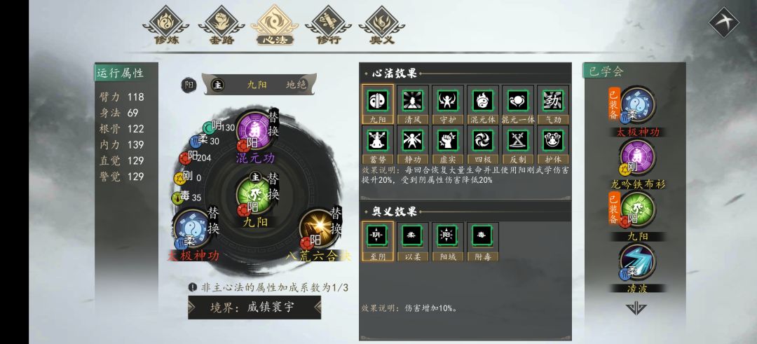 再来看心法,九阳意味着大量免伤,尤其是四维高,免伤更惊人,此外百分比免伤越往后叠效果越差,因为是乘法而不是加法,所以绝对数字的免伤尤其重要;八荒和太极都是反击,一次被打两次反击,基本敌人打到后来都经不起一次反击,所以太极比金阳更有作用,因为加了休息提升攻击的功能;混元特别重要,因为不吃状态,反击流必须不吃,易筋经那种免疫完全靠不住,并且回蓝足够给力,真气从头到尾都是满的。
