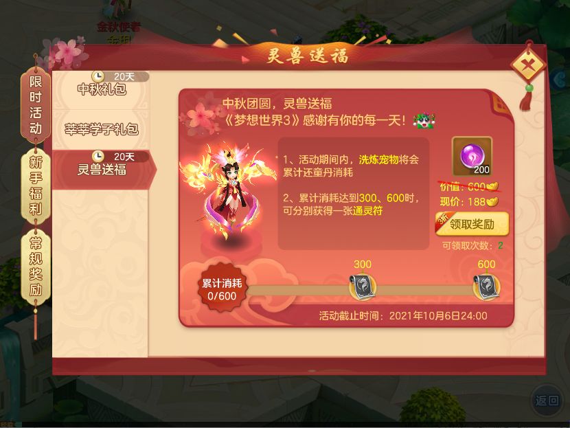 9月16日维护后~10月6日24:00,在活动期间内,累计洗炼宠物消耗还童丹一定数量可获得通灵符。