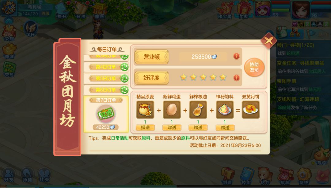 9月16日~9月23日5:00期间,少侠们可以参与7天日常收集原料制作月饼,完成订单后即可获得物品与抵用银两奖励(活动结束后将通过邮件发放月坊营业期间所获得的抵用银两)。