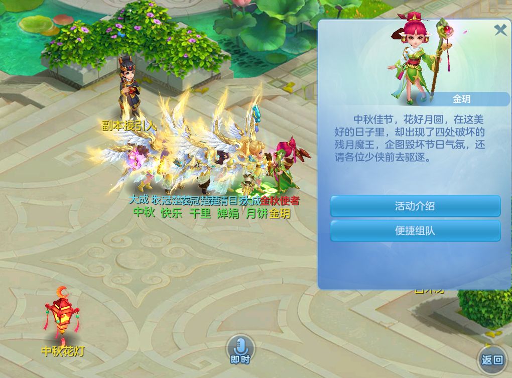 在9月16日~9月24日每晚19:00~23:00期间,少侠们可点亮中秋花灯获取奖励。