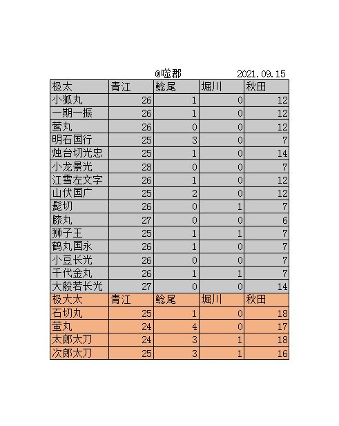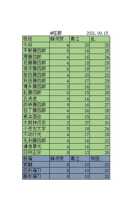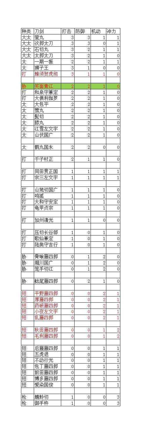 对比了一下,合成的刀剑最好是青江>二姐>骨头/鲶尾/堀川,然后是红字标注的短刀。宗三虽然很平均,但实际上用到会很少。