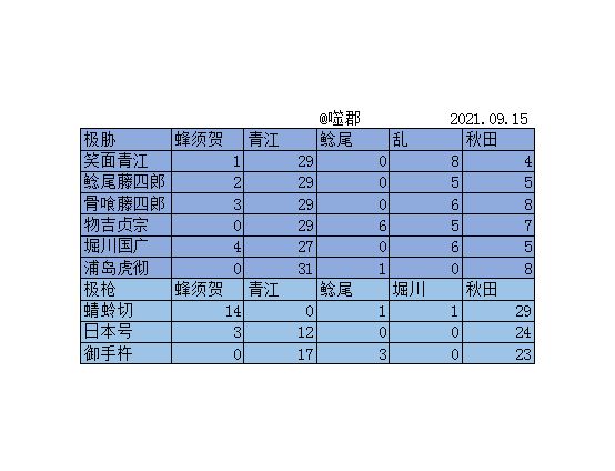 总体来说青江的需求量还挺大的,二姐的话捞刀时留几把就够了。如果要极化大太/太/枪/薙刀的话,记得留一些秋田就好。
