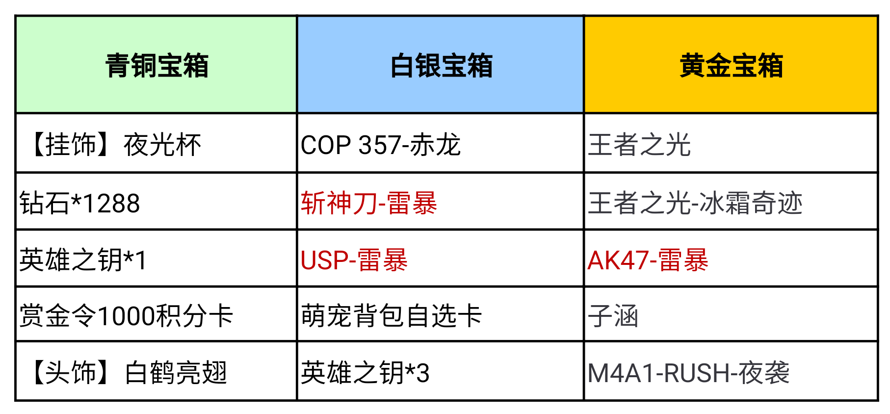 没在水晶奖池中抽到心仪奖励的CFer,可以消耗幸运值去许愿宝箱活动中抽奖。许愿宝箱就相当于该活动的保底奖池,里面有水晶奖池中的所有道具,详细奖励可参考下表。
