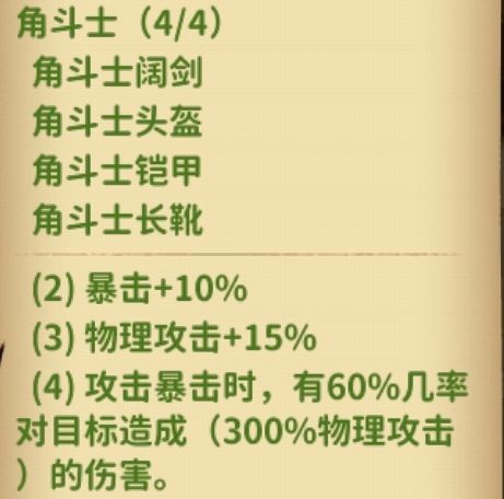 总结:这套角斗士套+公正套的搭配,装备获取简单,容易成型,输出够猛,很适合新玩家前期上手游戏和升级推关卡;缺点是梦境之塔1900层后开始卡。审判者角色的主流玩法是暴击盾或者格挡暴击盾。