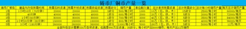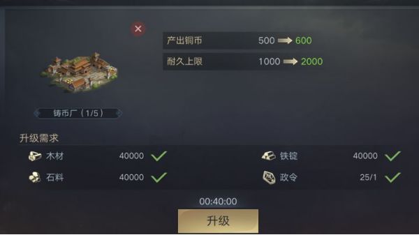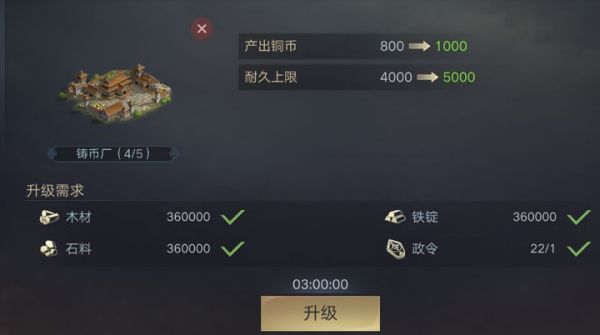 升级4级铸币厂,铜币产出变为800/每小时,耐久值变为4000。资源需求再次翻倍变为16万石料,木材,铁锭,以及一个政令。升级5个2级铸币厂则是需要80万石料,木材,铁锭,以及5个政令。升级时间为1个小时20分钟,与初始时间相似。
