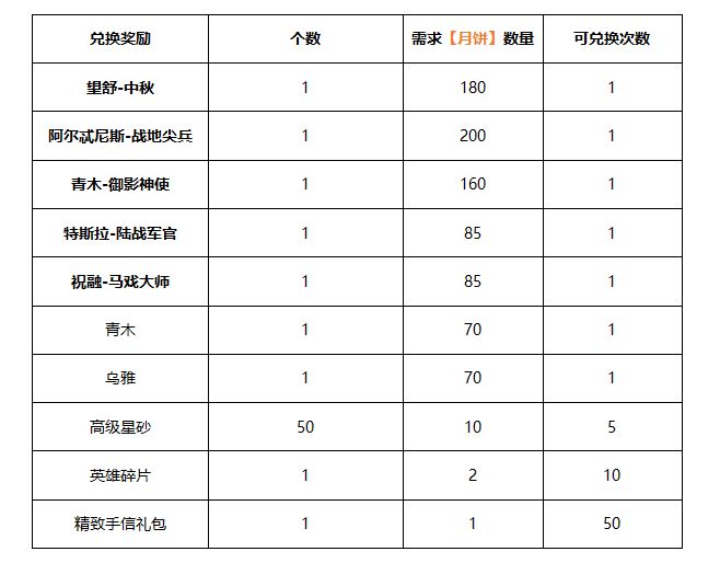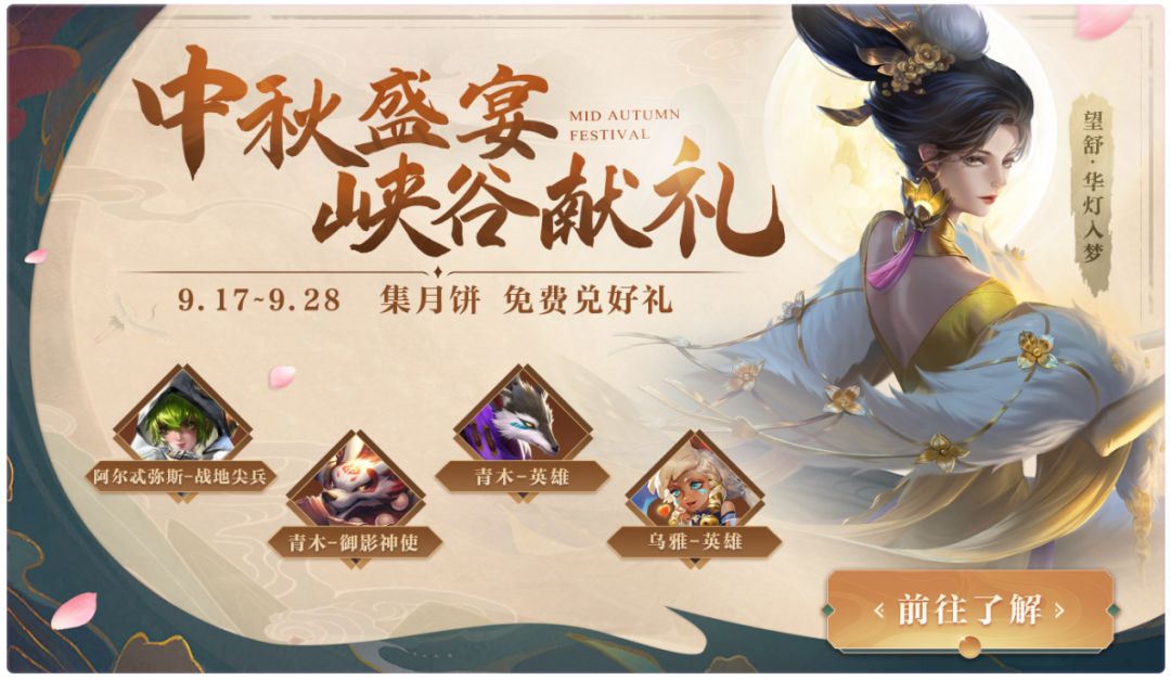 完成任务获取兑换道具【月饼】,即可兑换皮肤望舒-华灯入梦,阿尔忒弥斯-战地尖兵,青木-御影神使,祝融-马戏大师,以及其他人气好礼哦~