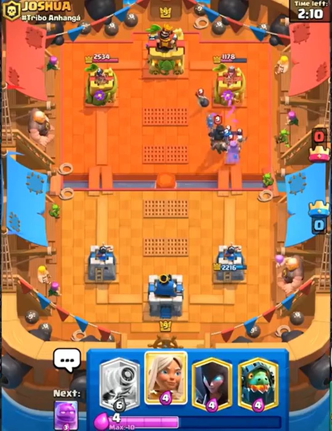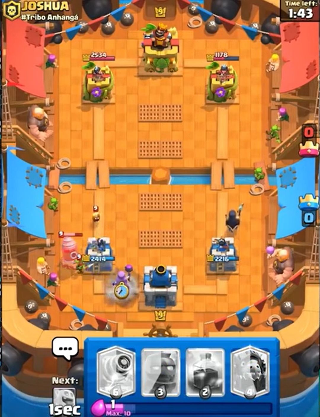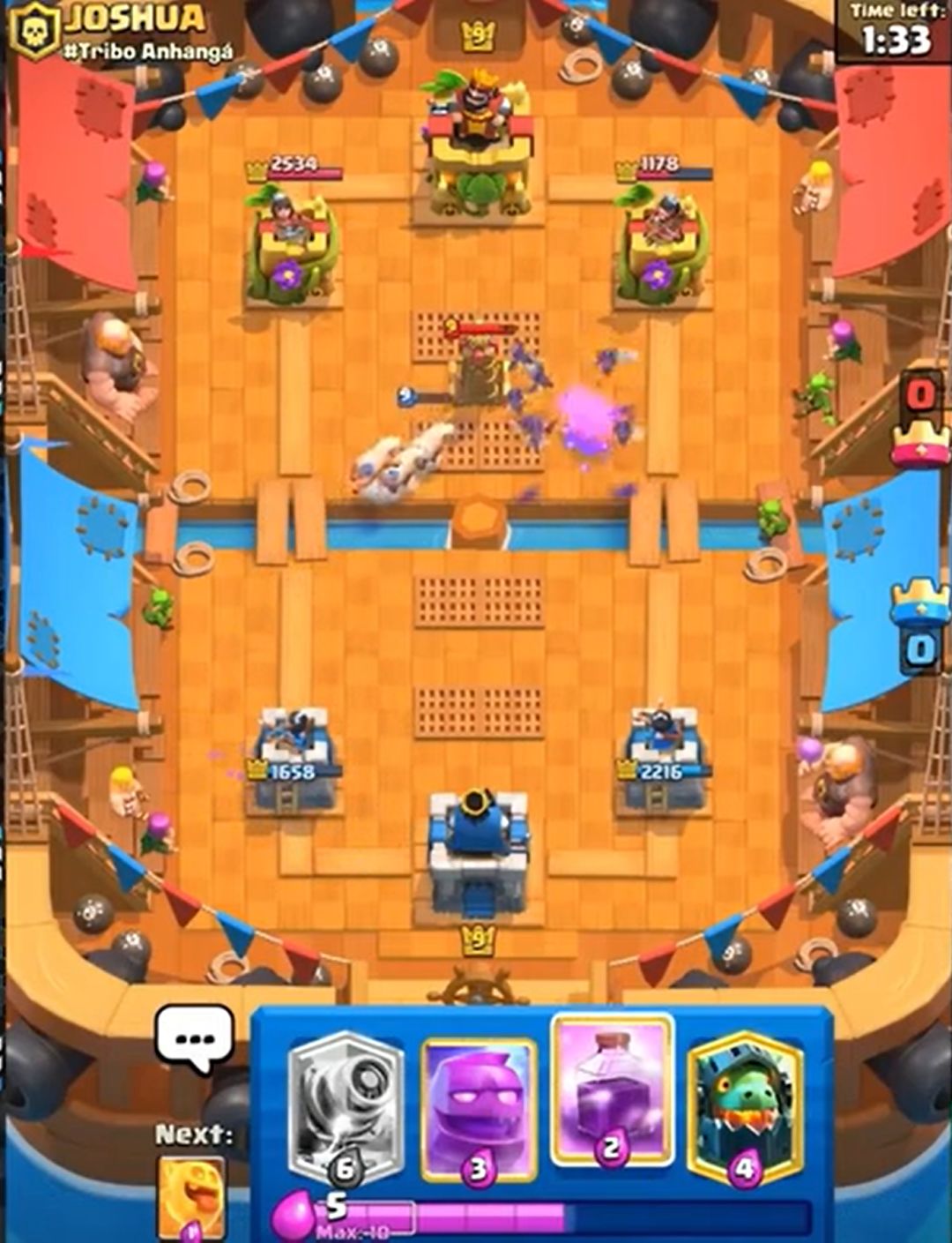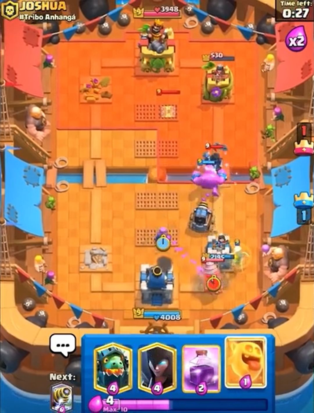 (对手这个钻机就是送,预示了对手差点被三星的结局。如果时间还多并且有塔血量健康的话,完全可以考虑打国王塔。多骚扰可以破坏攻势的成型,而且这套水人也没有什么卡是完全好解钻机的。所以遇到这种残局,注意不要被带节奏,卖不死国王塔就往死里卖,尽量让每一波进攻都有核心卡牌。至于卖血的度,2000+为健康,1000+就要衡量卖血的风险,<1000就要小心了)