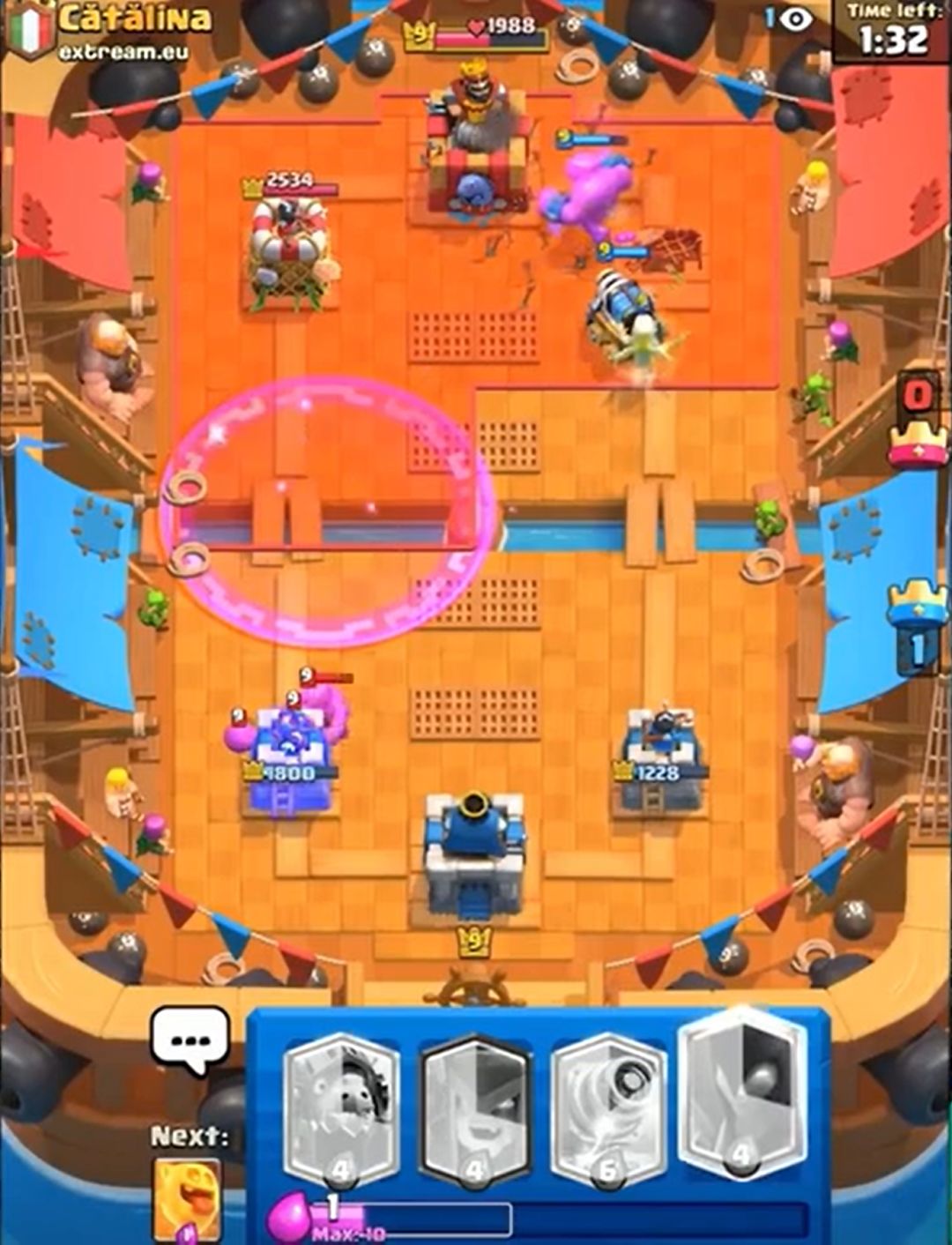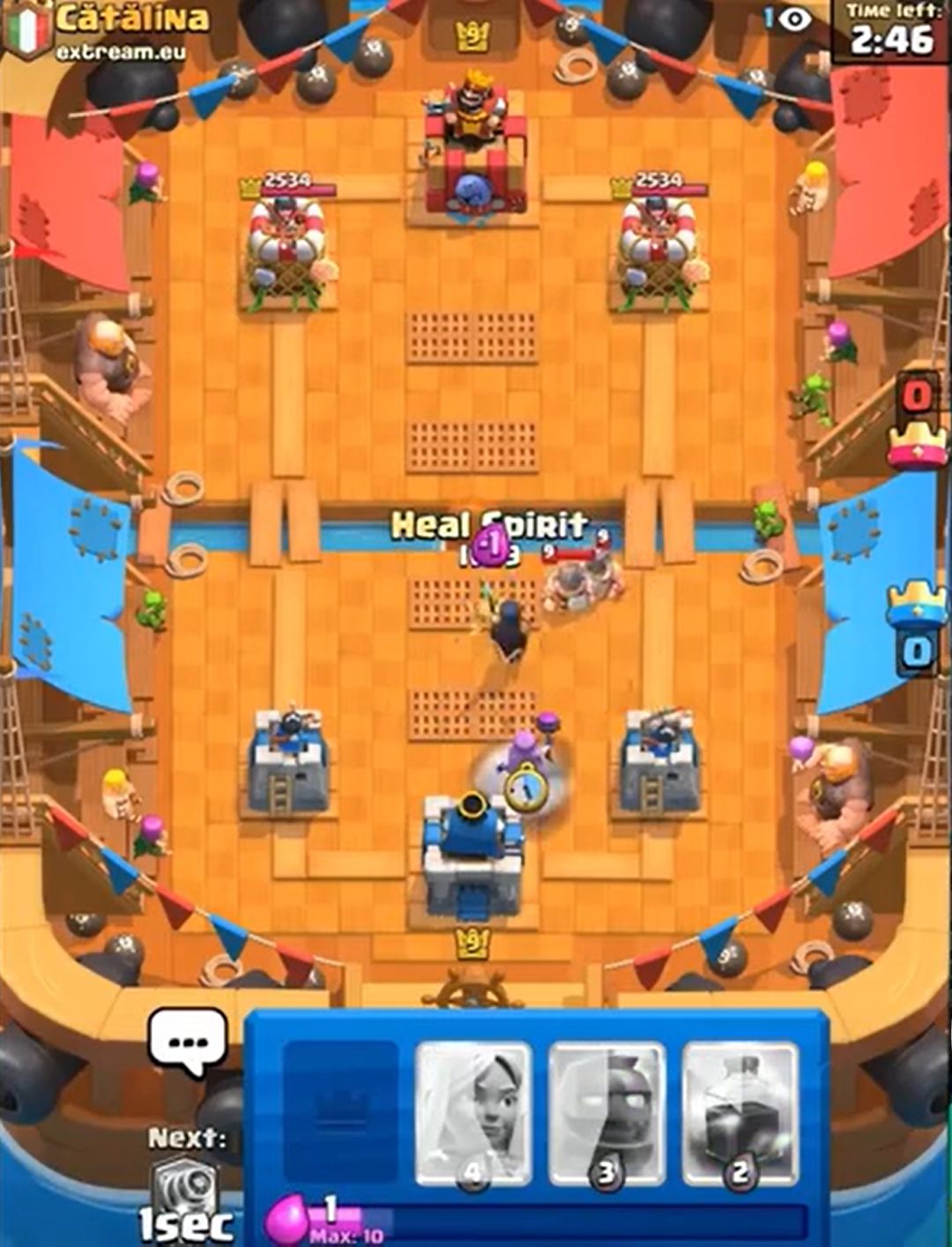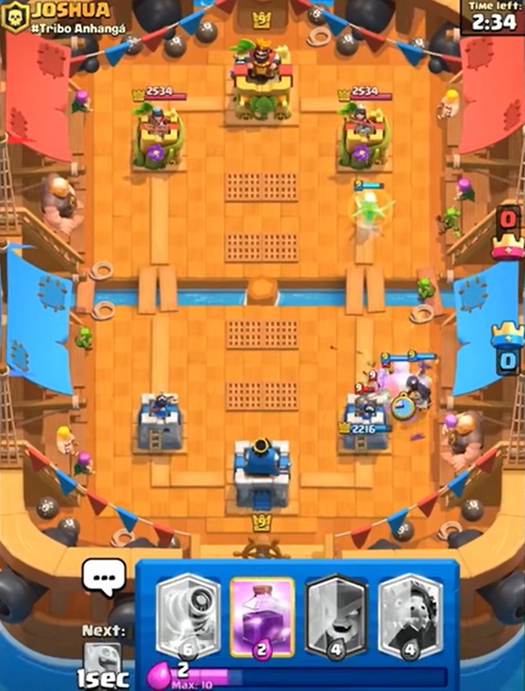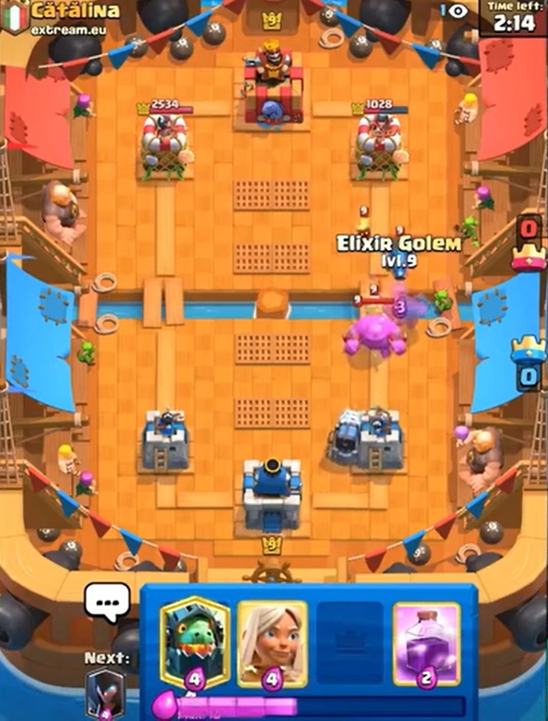 (对手这个钻机就是送,预示了对手差点被三星的结局。如果时间还多并且有塔血量健康的话,完全可以考虑打国王塔。多骚扰可以破坏攻势的成型,而且这套水人也没有什么卡是完全好解钻机的。所以遇到这种残局,注意不要被带节奏,卖不死国王塔就往死里卖,尽量让每一波进攻都有核心卡牌。至于卖血的度,2000+为健康,1000+就要衡量卖血的风险,<1000就要小心了)
