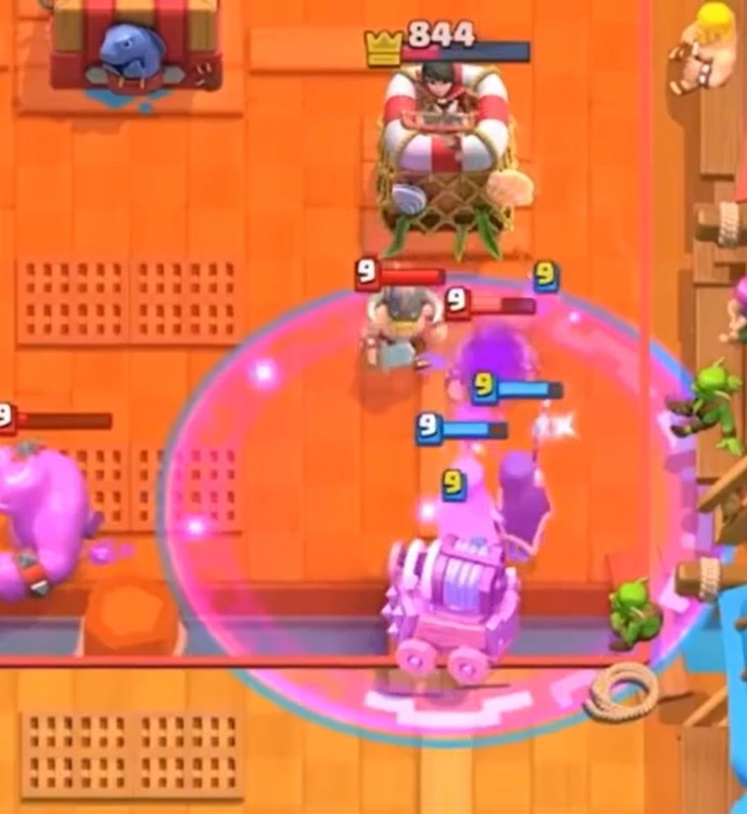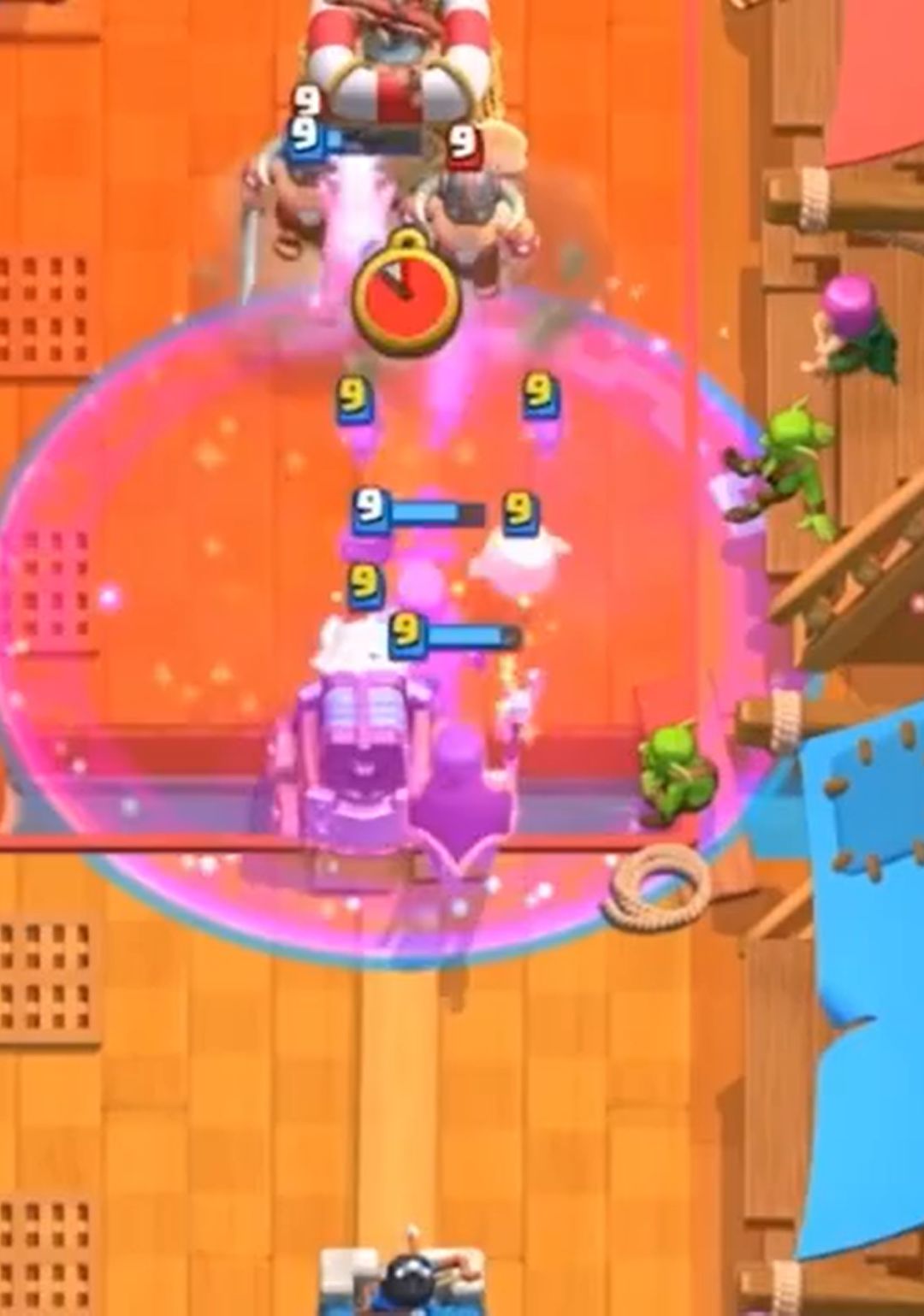 (这里放错边了,不得不多交一个女巫婆婆来防守。其实没必要预判钻机位置,只要盯准钻机,到首次出兵的时间足够反应了。另外,女巫婆婆其实也能防守钻机,具体方法是卖第一个哥布林的伤害,再下女巫婆婆把第一个哥布林变成猪,第二个哥布林的伤害会转移到第一头猪上,正好变出第二头猪。然后钻机爆炸,再变一头猪吸引剩下的伤害,以此类推。当然还是会吃到很多伤害,对手如果预判火球会掉得更多)