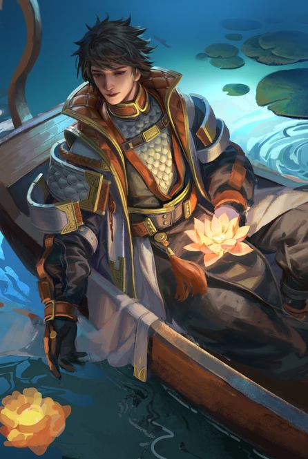 陆逊专属画卷【挑灯澄波】,他在船上侧身轻放莲花灯,似是在思念着某些人。
