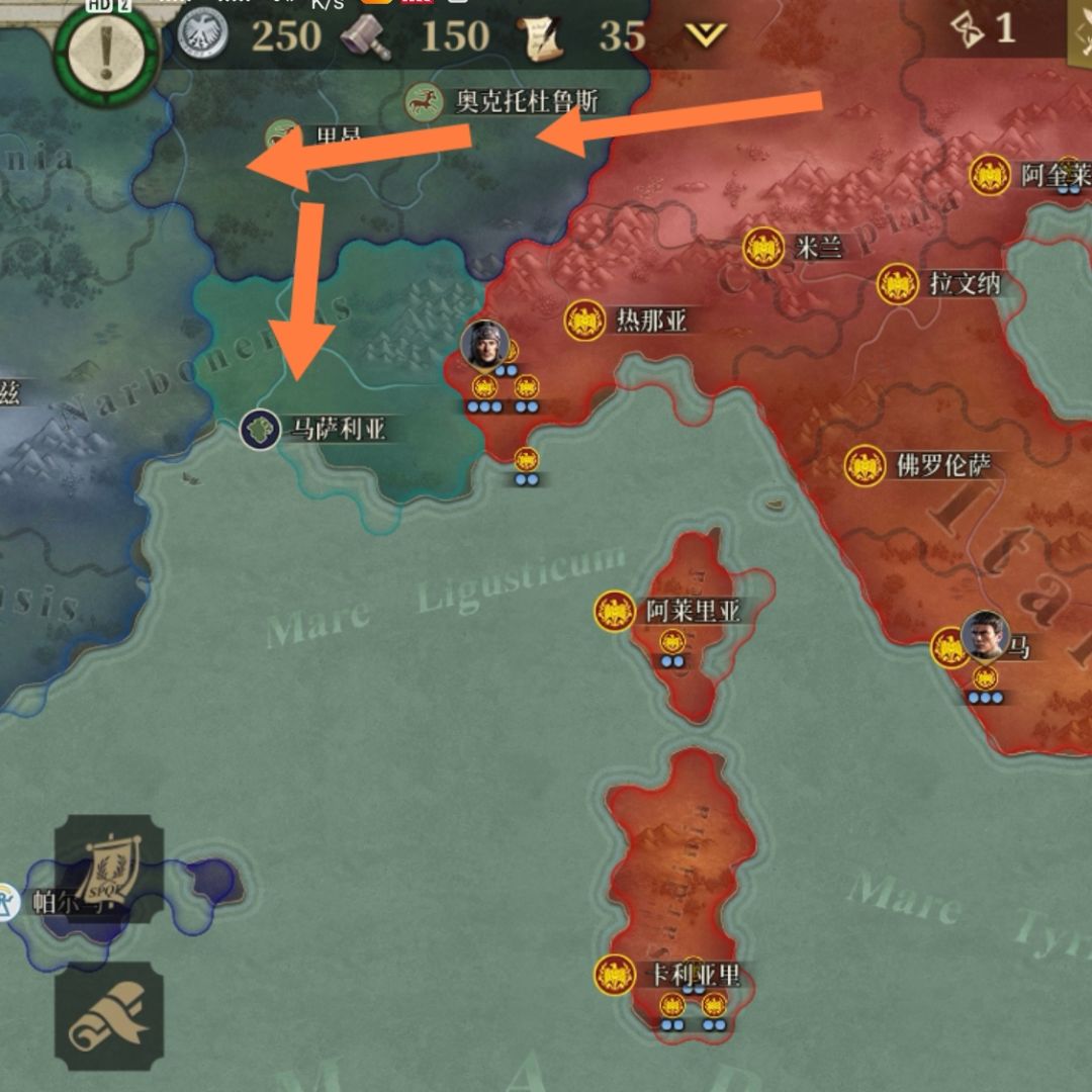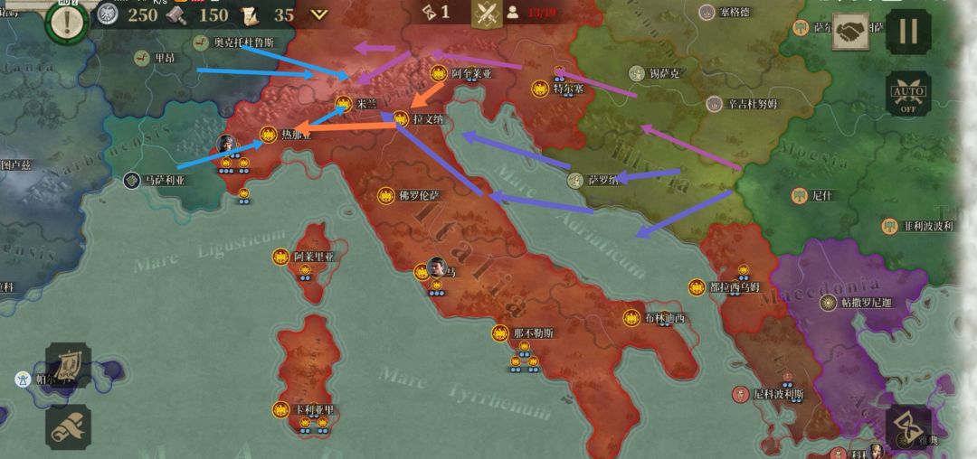 图中蓝色是敌人的进军路线,米兰腹背受敌。而在我军在米兰站住脚跟,挡住北面敌人后,罗马军队就可以以橘色路线安稳进军,攻击热na亚,截断敌人对米兰背部的攻击。