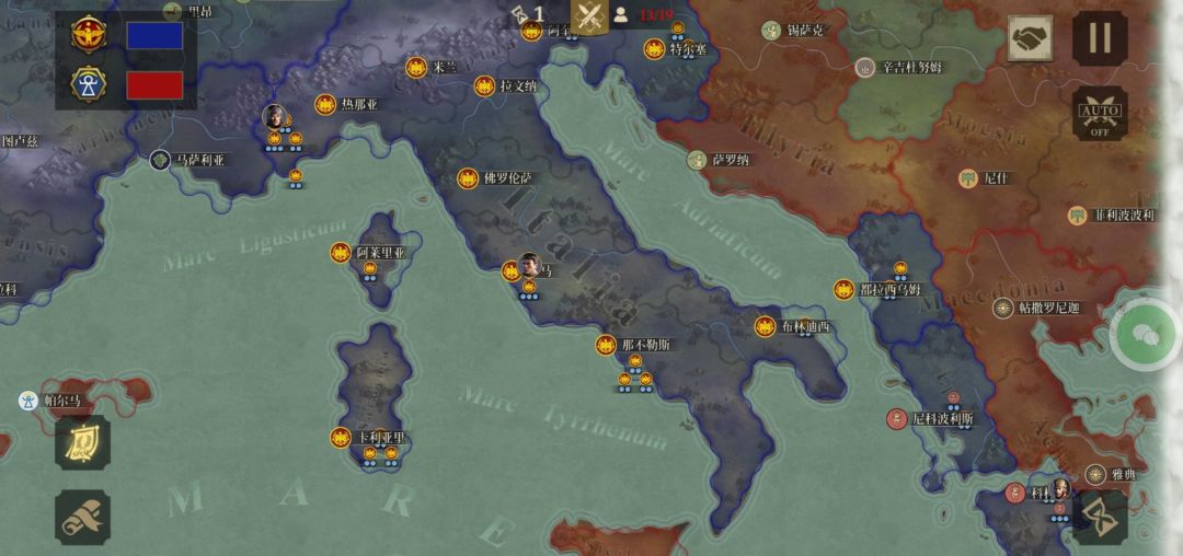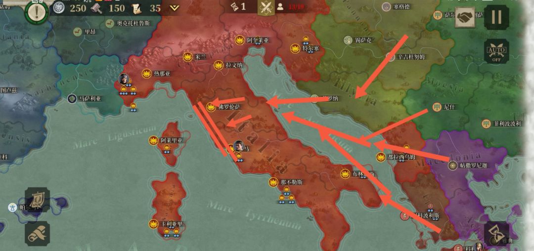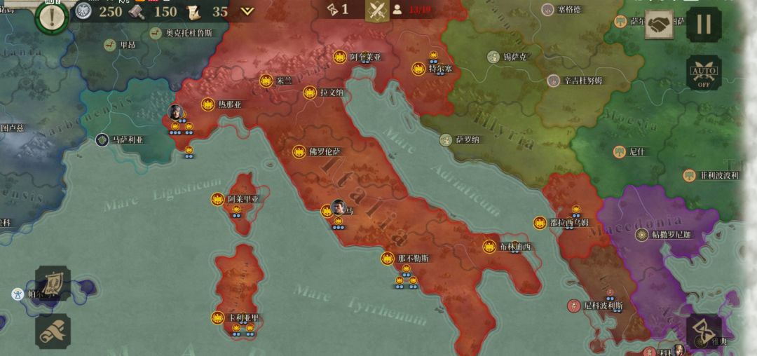 热na亚,米兰,阿奎莱亚的北面有一座山,所有的军事单位在经过这里时都只能移动一到二个单位,这极大的限制了敌人的行动,是一个战略要冲。三座城池连成一线,是军队东西走向的大动脉。而米兰则是大动脉的心脏,敌人一旦攻下米兰,则失去从拉文纳和阿奎莱亚出兵夺回***的可能(佛罗伦萨正在被反复争夺,后方兵力到不了前线),大量敌人将山北和***冲上罗马平坦的本土,罗马就此陷落。