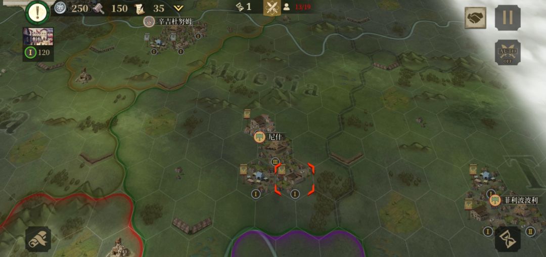 可以看到在地图右侧有三个敌对国和一个中立国。其中伊利里亚主攻方向是罗马的特尔塞,不用管。而马其顿就在同盟旁边,是第一个要解决的。
