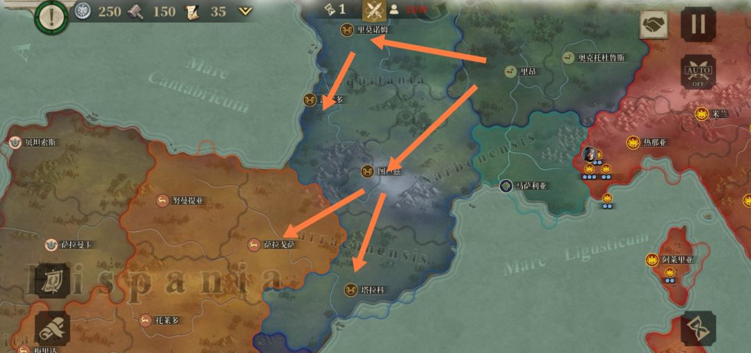 我的大军按照上图路线行军,一路高高兴兴拿下城池,但是我完全忽略了一个问题,我的军队在经历围剿,攻城和各种战斗的损耗后,已经处于崩溃的边缘(都是残血了),而这一路上,就是这个原苏埃塞塔尼的四座城池里,只有塔拉科有军营,其他都只是垃圾城池,而不是高价值目标。