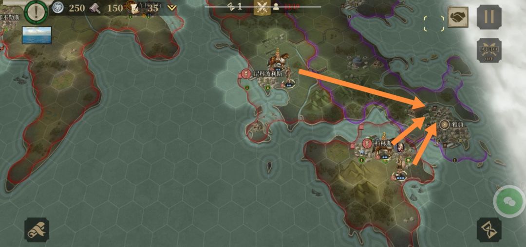 开局首先将科林斯的所有军队和尼城(简称)的骑兵调过去围着雅典主城池,由于马其顿王国还需要几个回合才宣战所以时间够用。