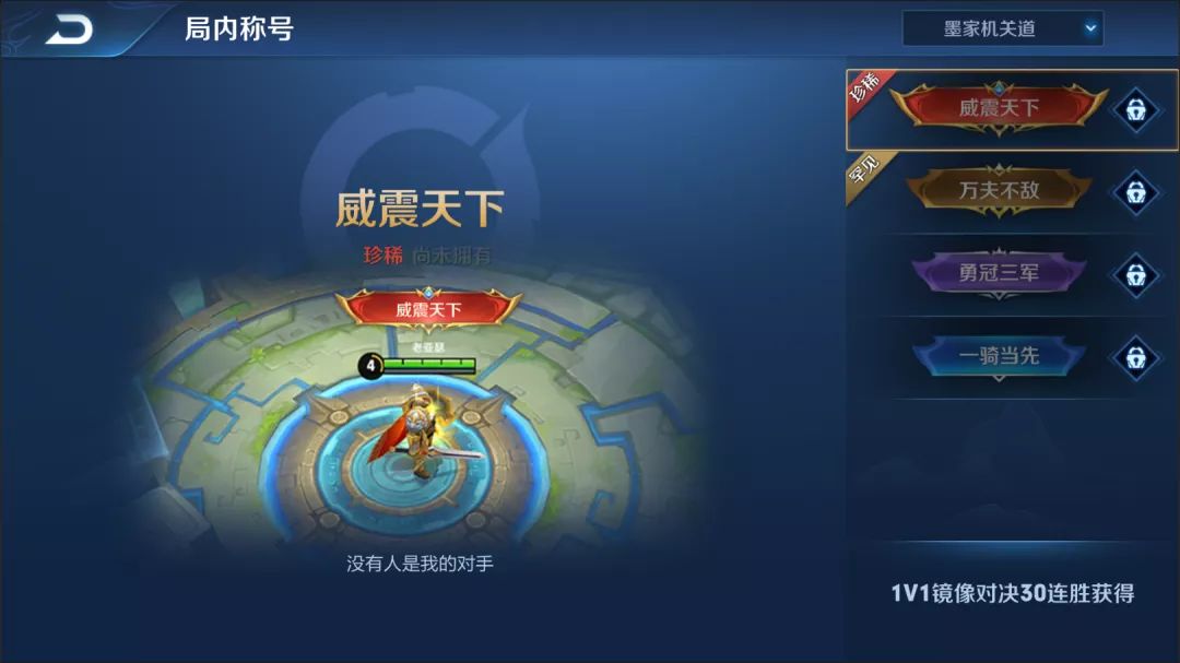 在镜像战中使用同一英雄获得30连胜:获得称号“威震天下”。
