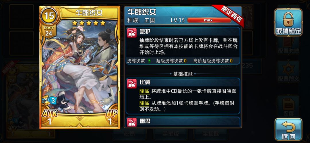 牛郎织女是七夕活动白送的急护星云卡,很好用,对付0cd,必须要封降临,暗堕则可以对付大部分非魔族卡,本身4cd,急护星云可以直接第一回合拉出来撑场,支持到双虎魄登场。