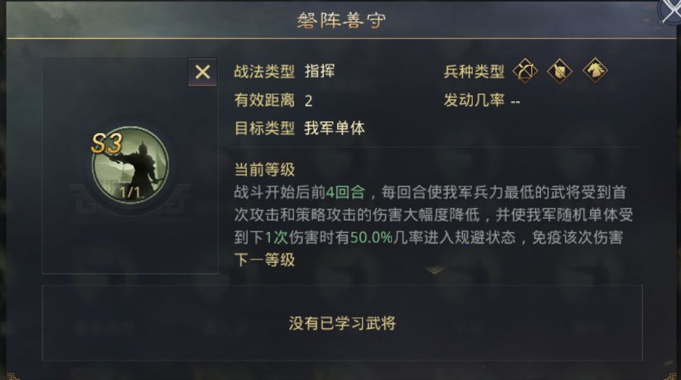 满级时,磐阵期望收益是4次己方单体受到伤害大幅降低效果和4次规避效果,