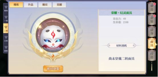 【面具精炼】-可在面具商店购买【面具精炼石】,点击后可对面具进行精炼【面具升品】-通过材料可将面具提升至紫品→红品,获得高额属性和特殊属性