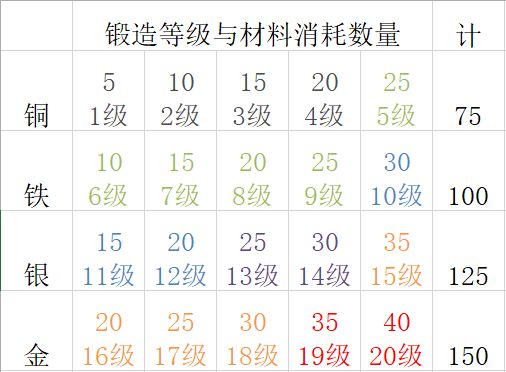 此外,将武器从0级锻造到20级,一共需要75铜、100铁、125银和150金。