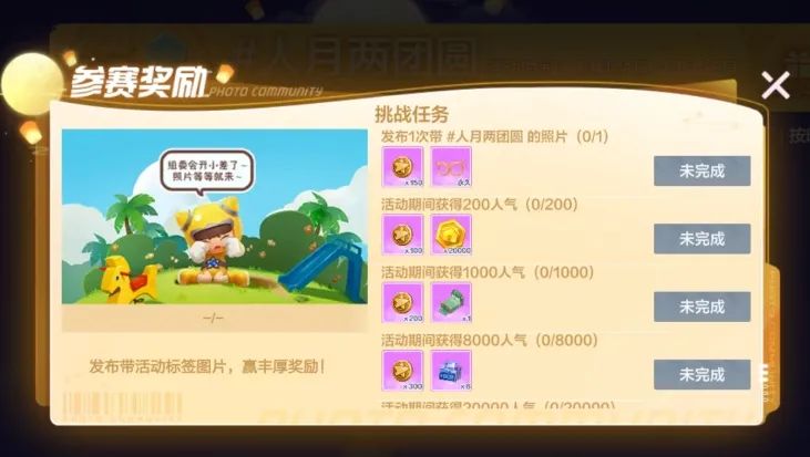9月21日起,车友们可以在游戏中参与星秀摄影活动。发布带#人月两团圆标签的照片就有机会获得家园币、眼镜、小屋建筑等珍贵福利!一起来看看活动详情吧~