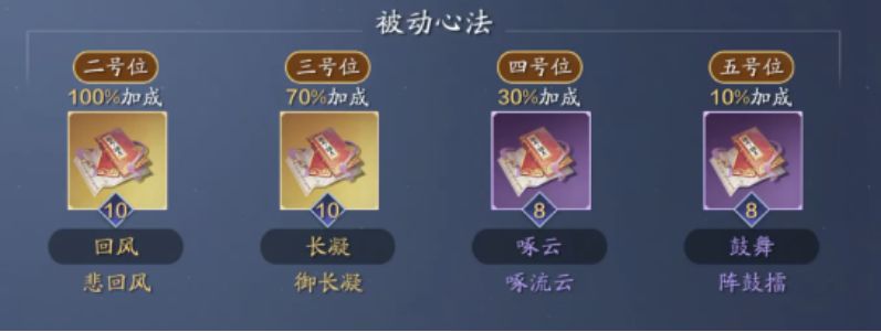 这五大职业可以选择这套被动心法,主动金色7级以上选金色。可能很多少侠比较好奇为什么不选破空明——因为御伤对于天波府效果不大,反而阵鼓擂在面对群怪的时候提供的伤害加成效果要更好一些。