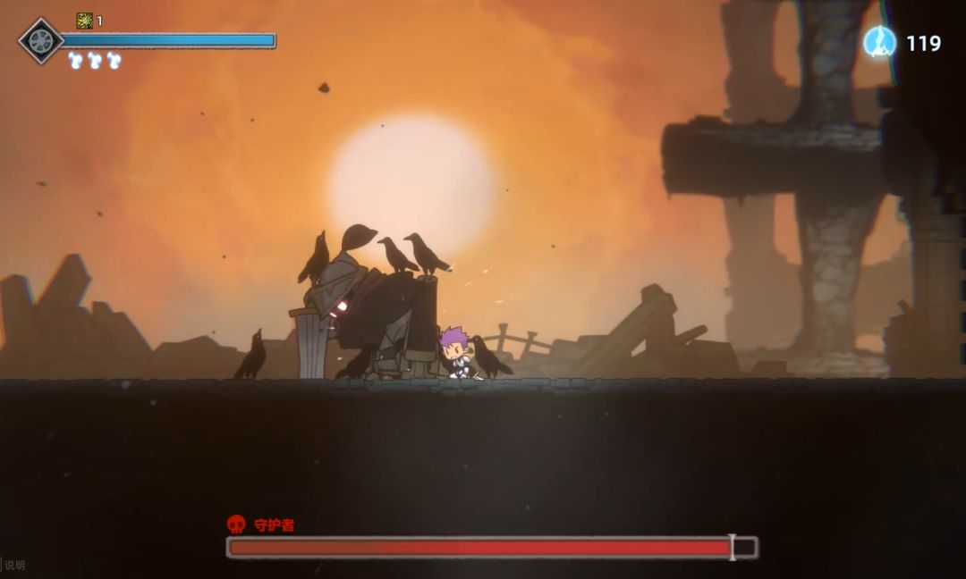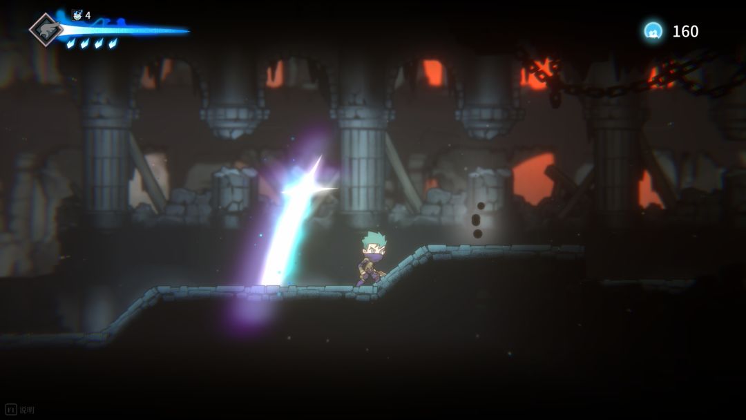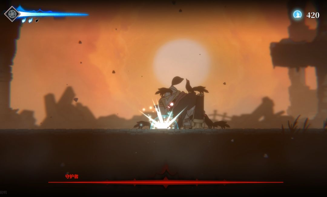 在革新以后的UI界面中,左上角的血量条改成了萦绕着火焰的长剑形,随着血量上限的提高,剑刃长度也会随之增长。另外血条下方的火焰修复次数图标也换成了更为直观的火焰形状~