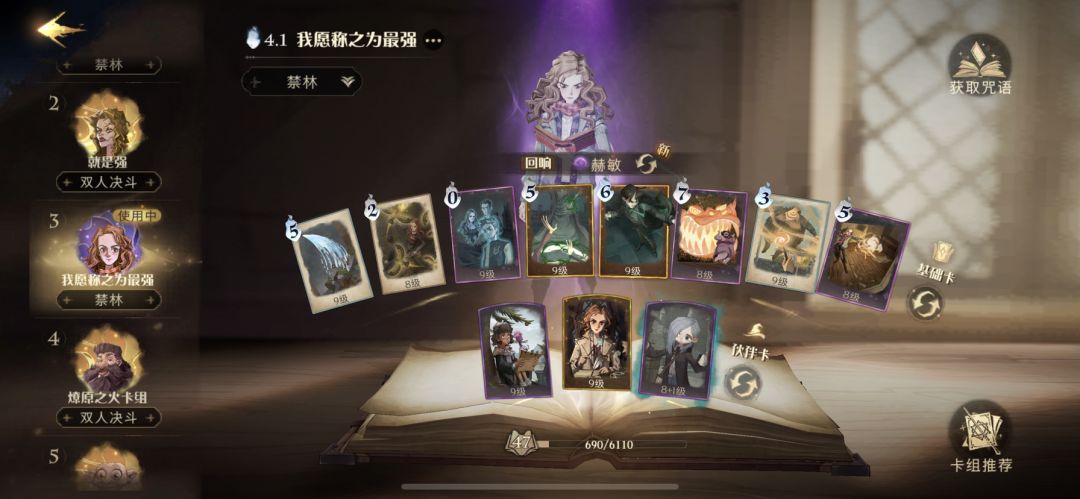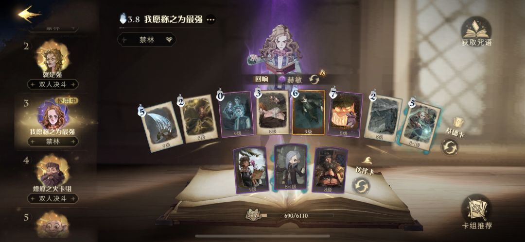 这是我的卡组,上了钻心,漂浮,霹雳爆炸,不要统统加护和香精,其中一个队友之前的吹风不要了剩下的都一样,重点是火伴必须是赫敏和艾薇。