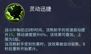 灵动迅捷:战斗中每经过8秒时间,浣熊射手的攻速自动提升为15,移动速度提升6%,该效果可叠加,上限为5层。