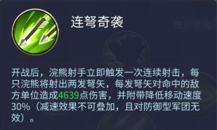 连弩奇袭:开战后,浣熊射手立即触发一次连续射击,每只浣熊将射出两发弩矢,每发弩矢对命中的敌方单位造成4639点伤害,并附带降低移动速度30%(减速效果不可叠加,且对防御型军团无效)。